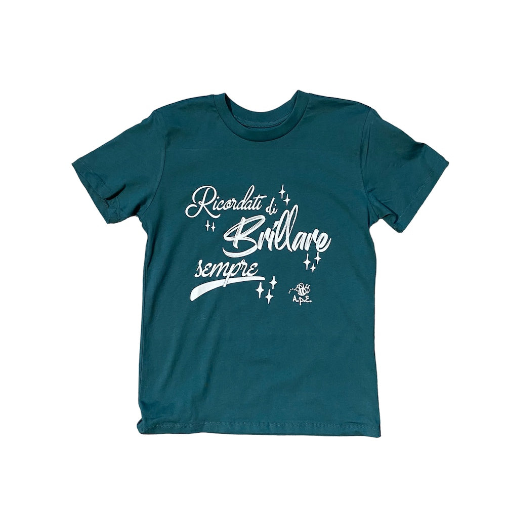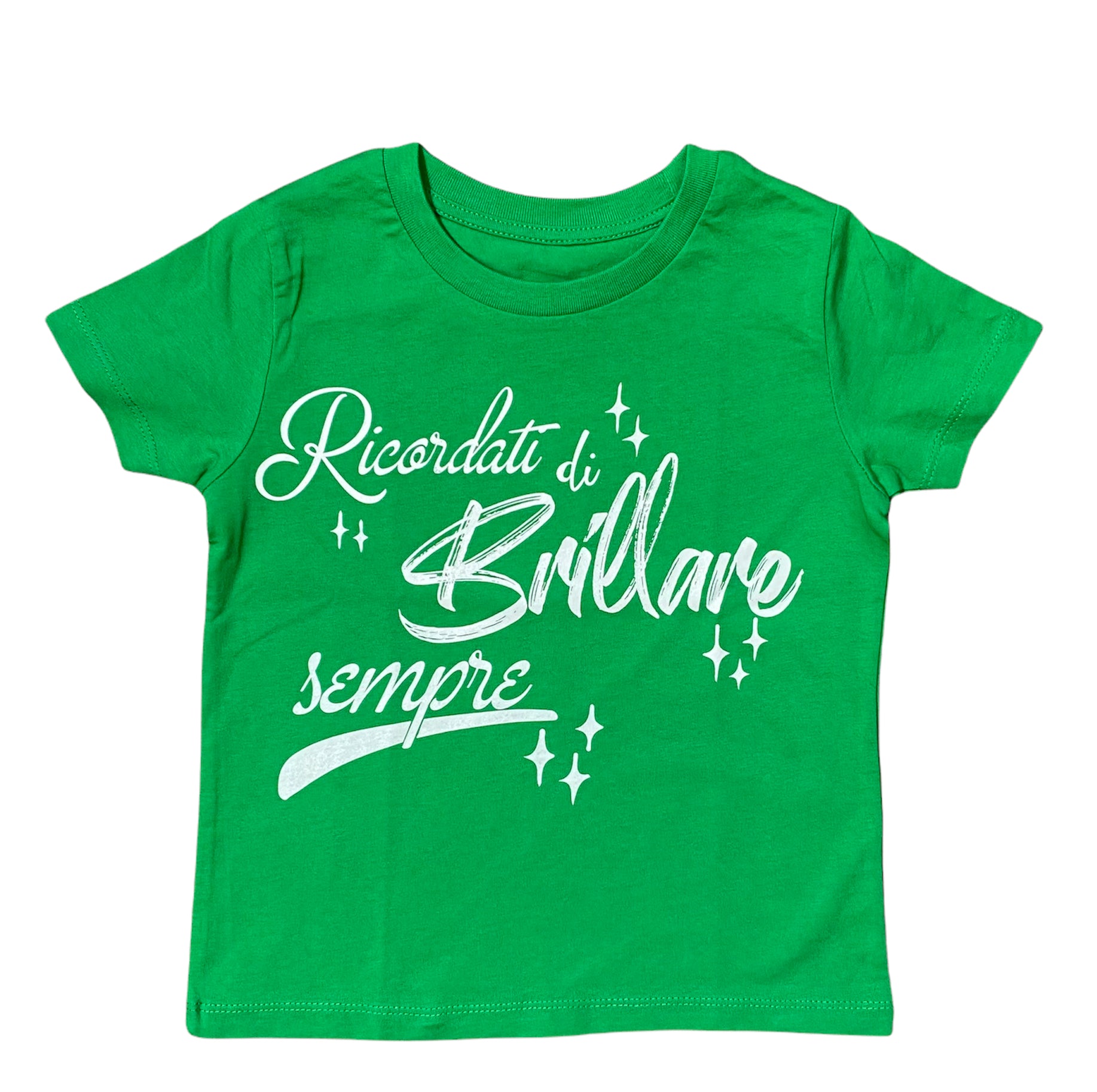 Children's T-shirt from our collection in 100% organic cotton, hand printed by children with disabilities. The phrase RICORDATI DI BRILLARE SEMPRE will be the perfect gift that parents can give to their children. The wish to always be smiling and proactive at all times.