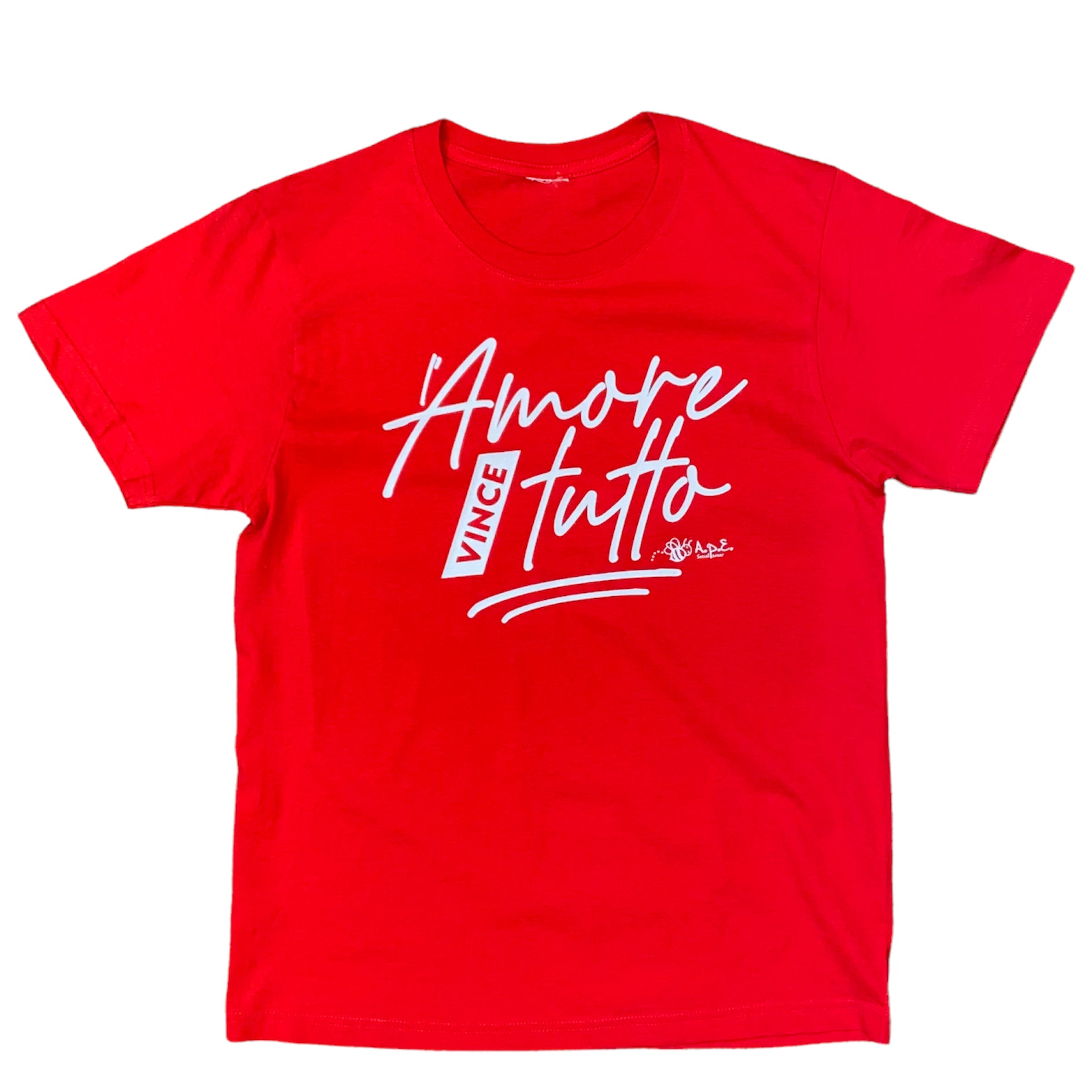 Wear this T-shirt from our 100% organic cotton collection. Hand-printed by people with disabilities, it carries a message of hope: LOVE CONQUERS ALL. Dedicated to the phrase by Chiara Lubich that also inspired Gen Rosso's song, this T-shirt encourages us to overcome everyday difficulties, with love that can do great things. This garment is the result of the collaboration between Gen Rosso and the graphic designer Mattia Biffi.