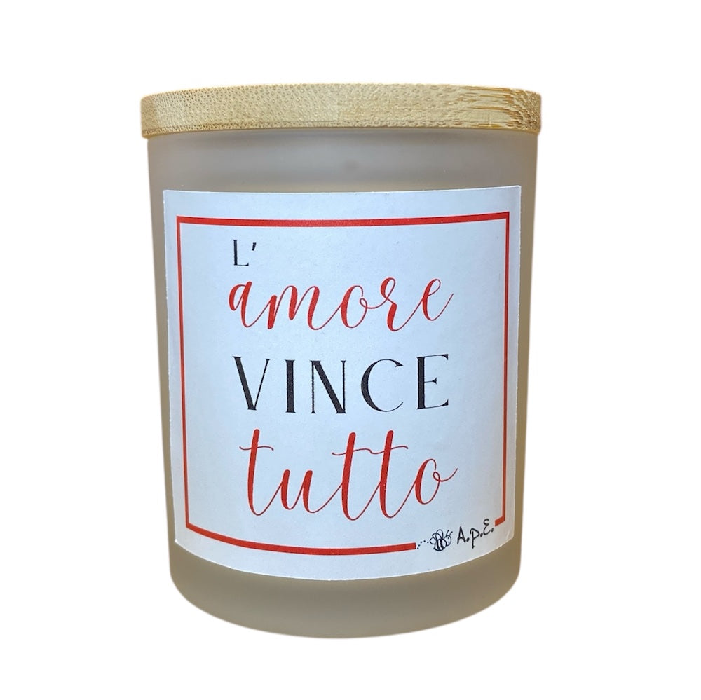 Candela profumata all'aroma di vaniglia in elegante vaso di vetro satinato con tappo in bambù naturale, personalizzata con la frase "L'AMORE VINCE TUTTO".