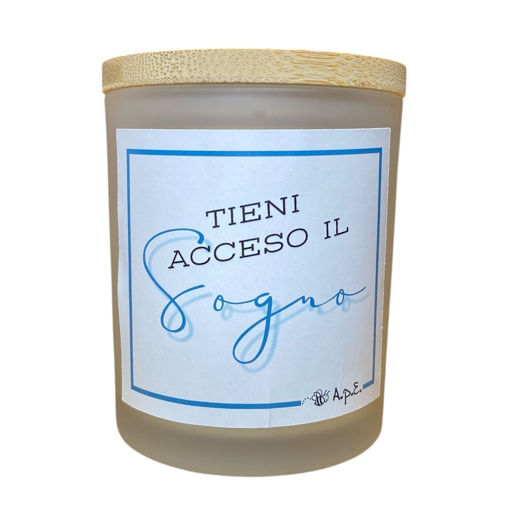 Candela profumata all'aroma di vaniglia in elegante vaso di vetro satinato con tappo in bambù naturale, personalizzata con la frase "TIENI ACCESO IL SOGNO".