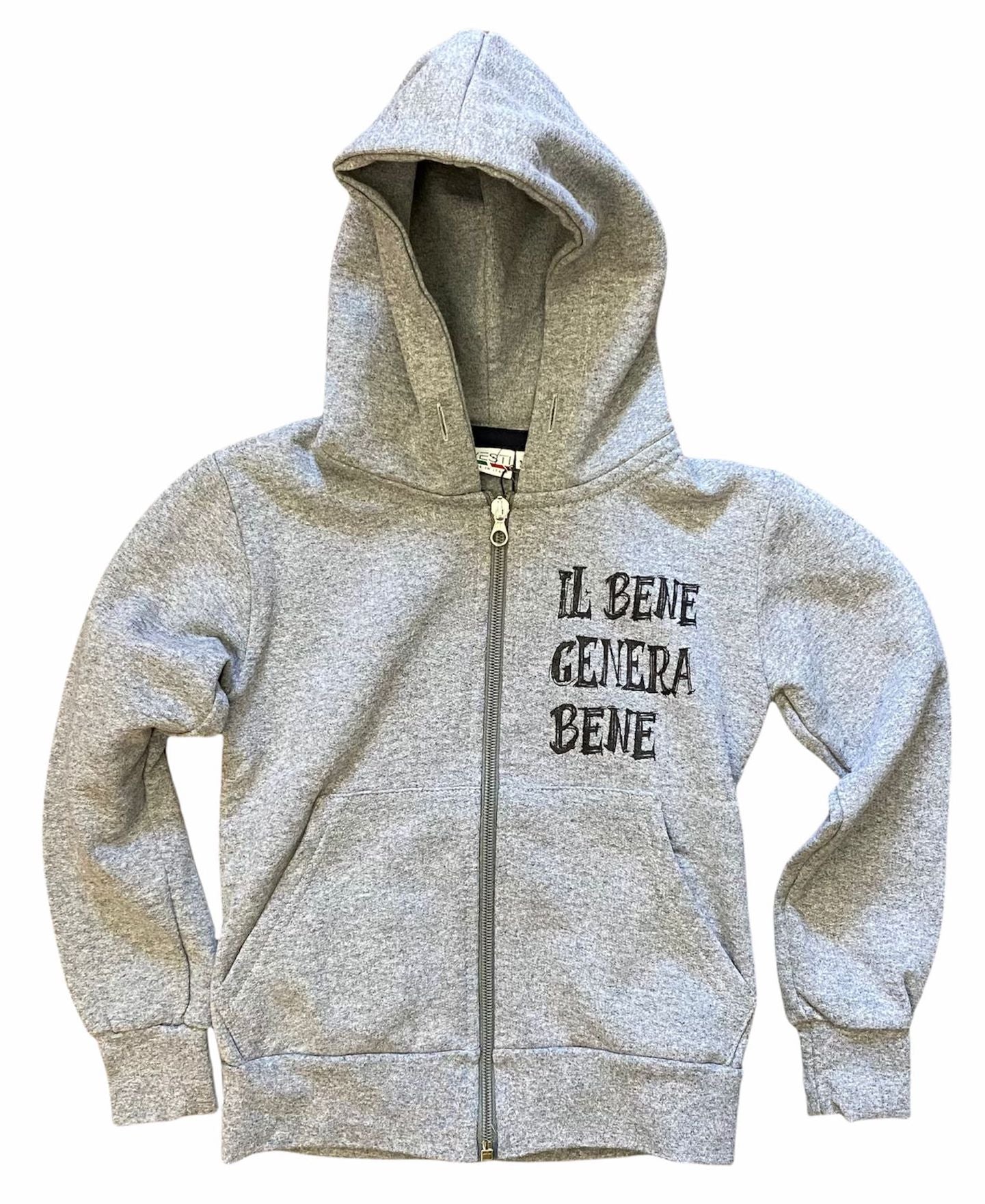 Felpa bambino con stampa a lato cuore "IL BENE GENERA BENE". Cappuccio e zip tasche a marsupio. Bordino di rinforzo al collo in colore a contrasto. Produzione interamente italiana dal filato al prodotto finito.