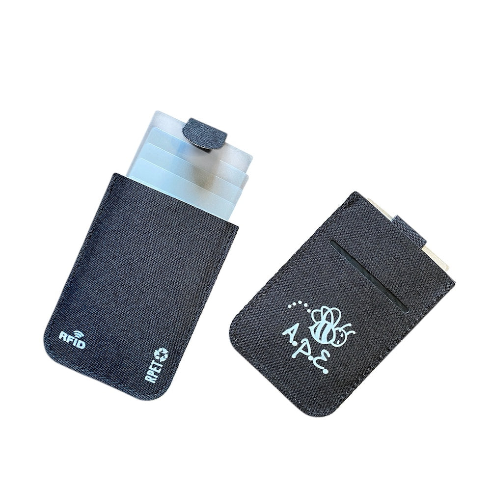 Elegante portacarte in poliestere RPET con finitura nera. Con chiusura magnetizzata, capacità di 5 carte e meccanismo di estrazione tirando la cinghia di chiusura. Con la tecnologia di sicurezza RFID (Radio Frequency Identification) che protegge i dispositivi di trasmissione dell'identità. Logo RPET e RFID all'esterno.
