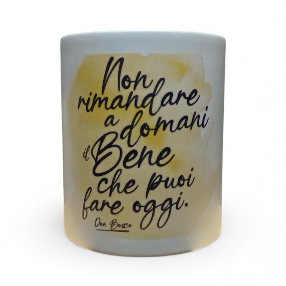 Tazza in ceramica opaca con la celebre frase di Don Bosco: "Non rimandare a domani il bene che puoi fare oggi". Un messaggio di speranza e azione che accompagna ogni momento della giornata.